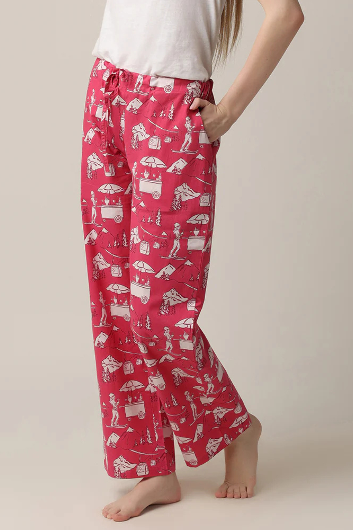 This playful print is a snowy daydream—skiers, cable cars, and hot cocoa carts scattered across a bold berry red backdrop make it feel like a cozy mountain escape!