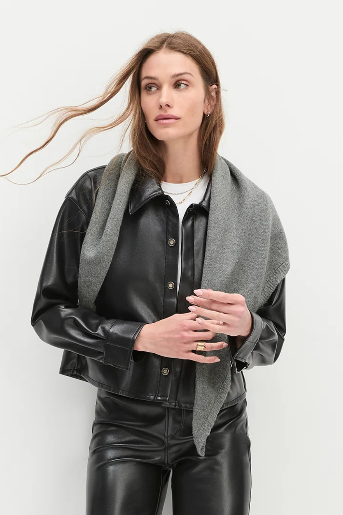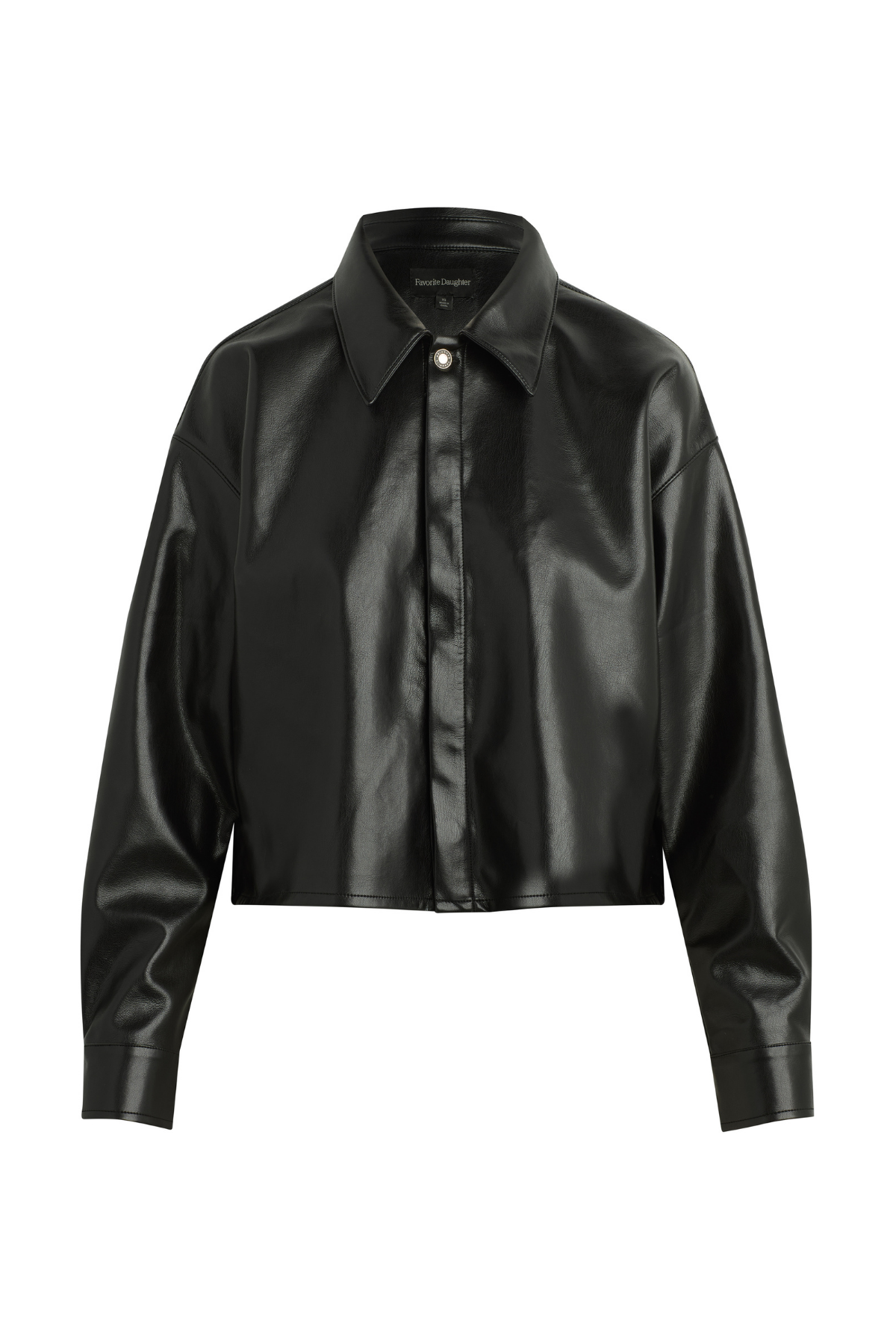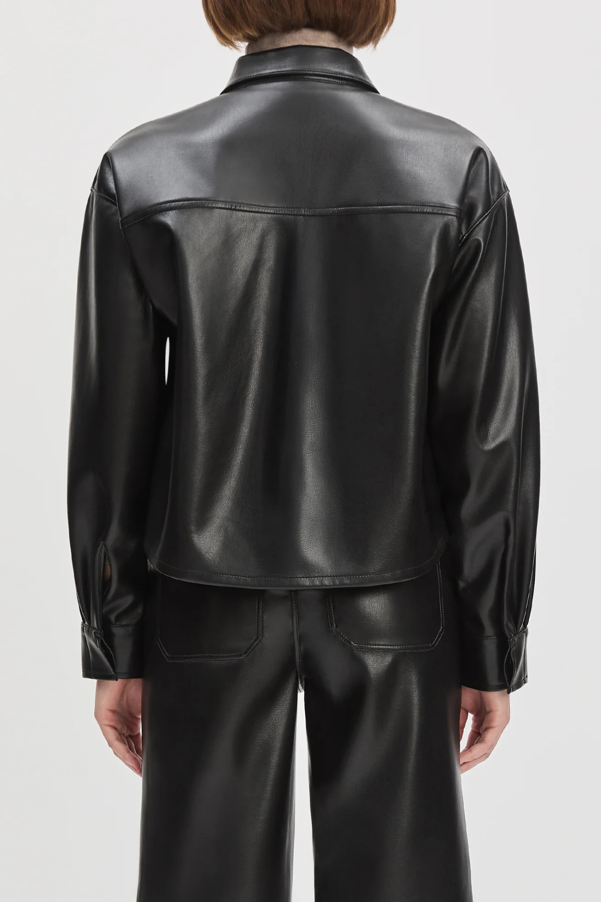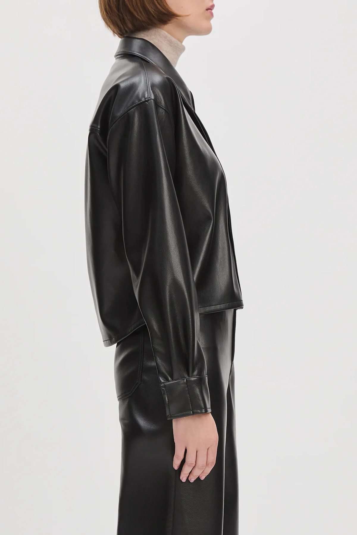 The Brady Crop Shirt in vegan leather is designed for a loose, oversized fit that hits just below the waist for the perfect untucked look. Pointed collar, hidden front buttons and dropped shoulders are standout features.