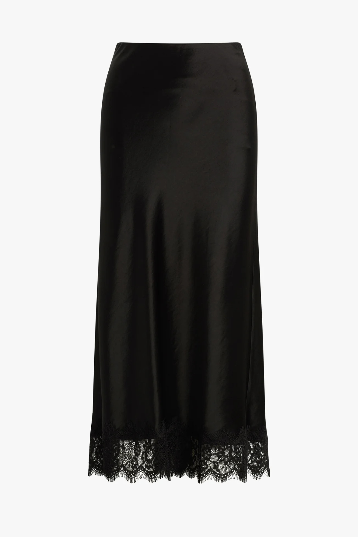 This skirt is cut from textured fabric with a subtle sheen. The bias-cut silhouette sits high on the waist, skims the body, and falls into a billowy fit with 54" length. The lace trim is the finishing touch (a little thrill we can’t resist).