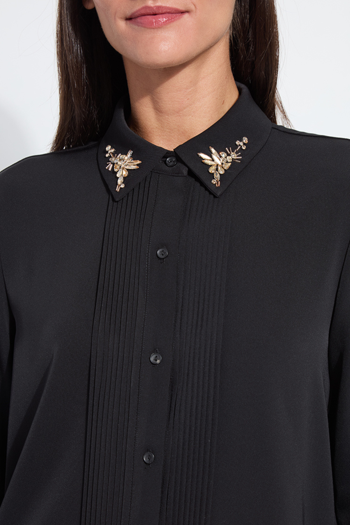 Made from wrinkle-resistant Stretch Woven fabric, the menswear inspired Lizeth Embellished Tuxedo Shirt showcases tuxedo pleating, cuffs with buttons, a double-self yoke, hand-done light gold embroidery at the collar, and a deep back pleat. This elevated top offers 2-way stretch and styles wonderfully with the menswear inspired Darcy Pleated Wide Leg Trouser.