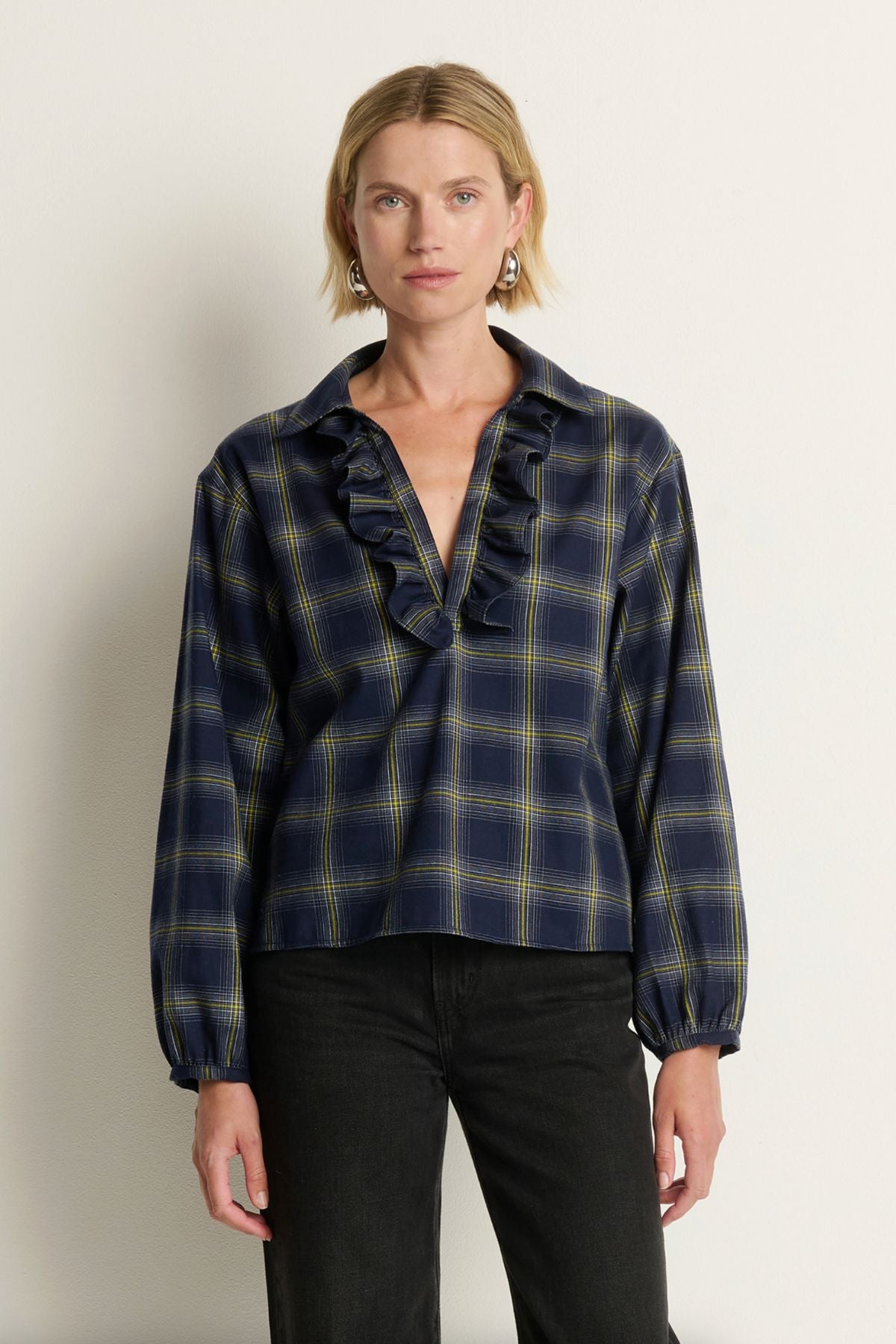 Sueded flannel gets a sophisticated upgrade with the Beckett Blouse. Crafted from 100% cotton in a starry night plaid, this piece transforms casual comfort into something distinctly refined. The relaxed silhouette, keyhole neckline, and gently puffed sleeves create an effortlessly polished aesthetic—feminine without sacrificing the cozy appeal that makes flannel a wardrobe essential. Perfect for layering or wearing solo, it's the ideal bridge between laid-back and elevated.