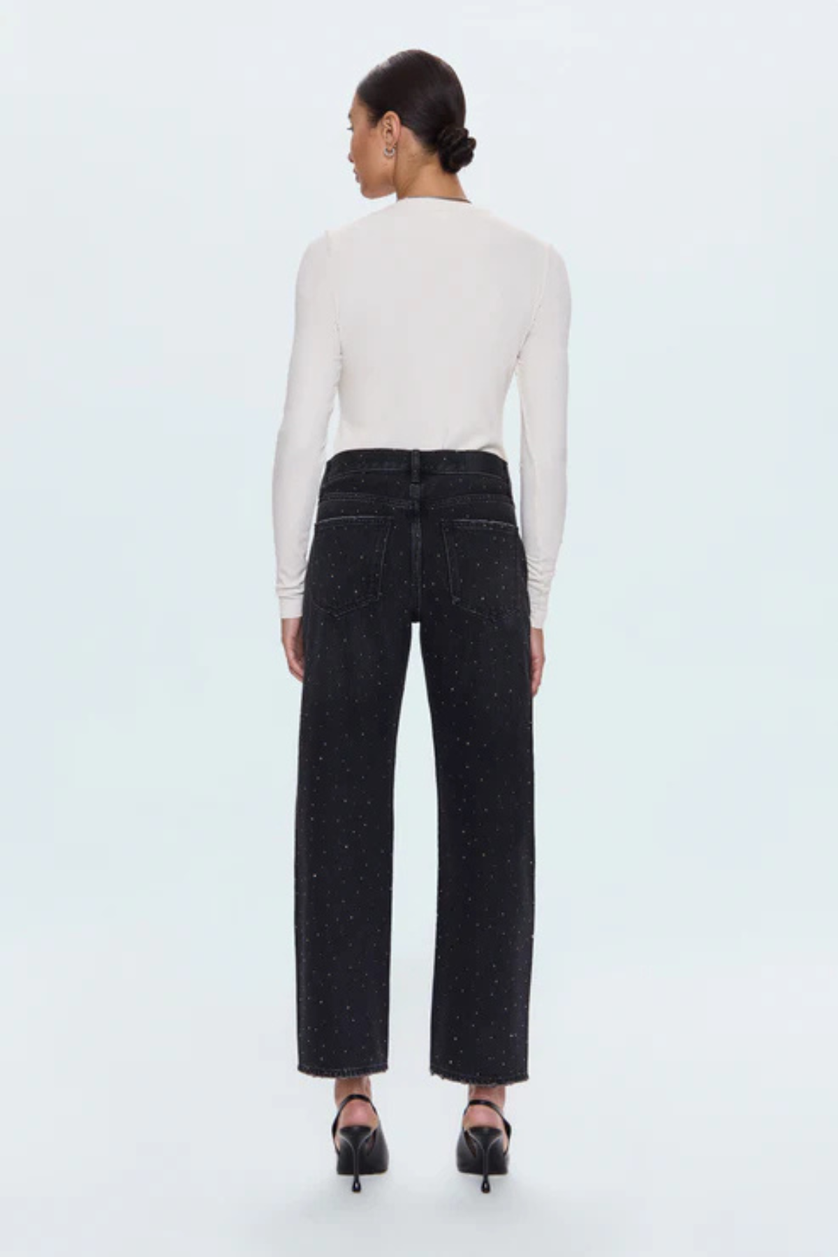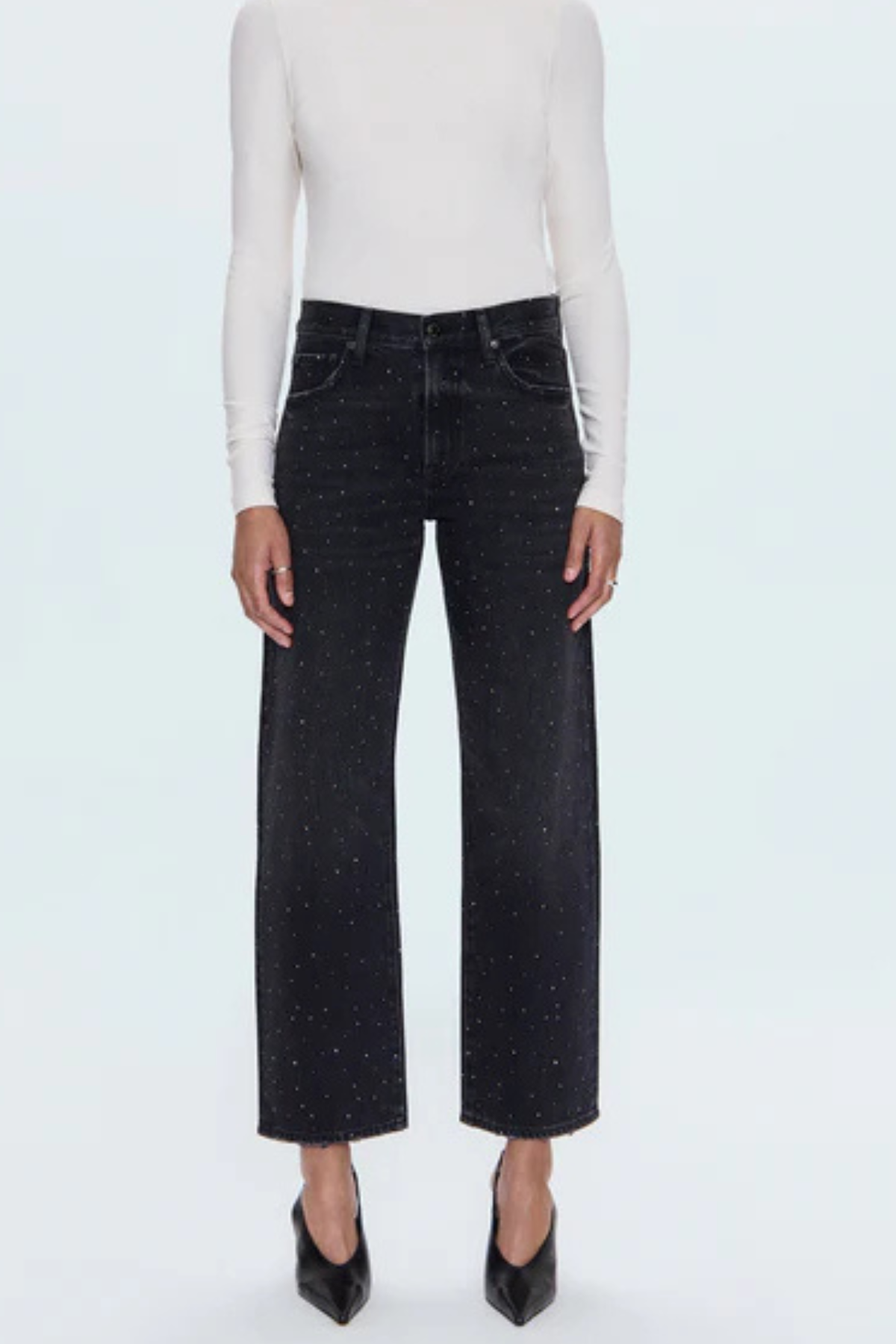 A best-selling silhouette, Lexi features a mid-rise and signature bowed straight leg with a subtle curve through the knee for dimension and ease. The 29" inseam tapers to a clean, cropped ankle. Crafted from rigid denim in Silver Screen, a black wash adorned with micro rhinestones that catch the light for understated shimmer.